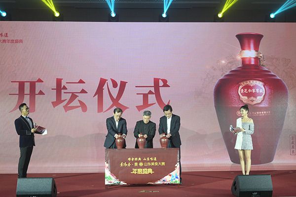 ▲魯菜理論專家、山東省旅游學(xué)院原教授趙建民,中國白酒工藝大師、景芝酒業(yè)總經(jīng)理來安貴,中國白酒大師、景芝酒業(yè)常務(wù)副總經(jīng)理趙德義為美酒啟壇